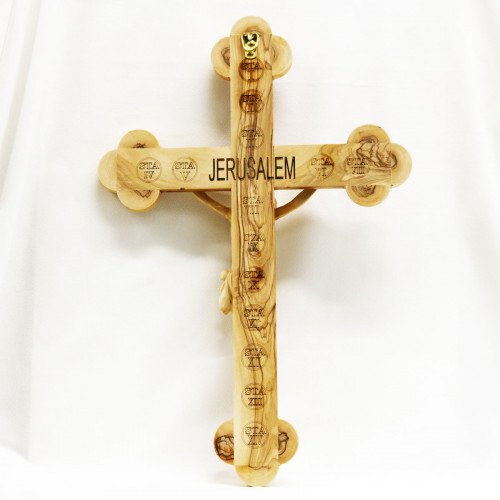 Crucifix with Olive Wood Jesus with 5 Relics from Holy Land (Stones, Earth, Frankincense, Olive Tree Leaves, Jerusalem Flower) with 14 Stations of the Cross Carved on the Back